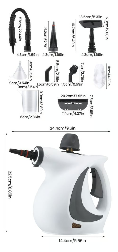 The cleaner comes with 8 accessories: a measuring cup, funnel, window cleaning tool, round nylon brush, upholstery tool, standard nozzle, towel sleeve, bent nozzle, and a 22.4-inch flexible hose with gun nozzle for versatile cleaning.