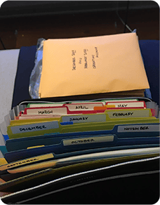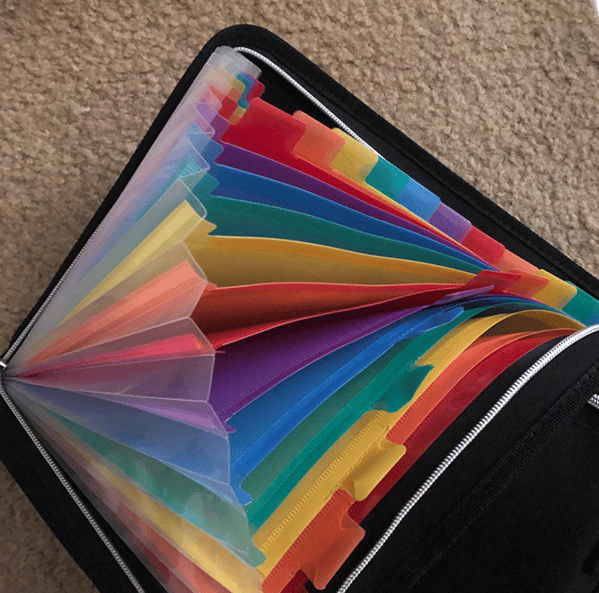 A: Sie enthält mehrere beschriftete Taschen und Abschnitte, sodass Sie Ihre Dokumente mühelos sortieren und darauf zugreifen können.